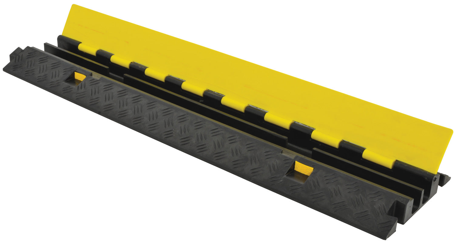 A heavy duty cable protector with two cable ducts. Made from recycled rubber and UV resistant high density pressure moulded Polyurethane, black with yellow lid.