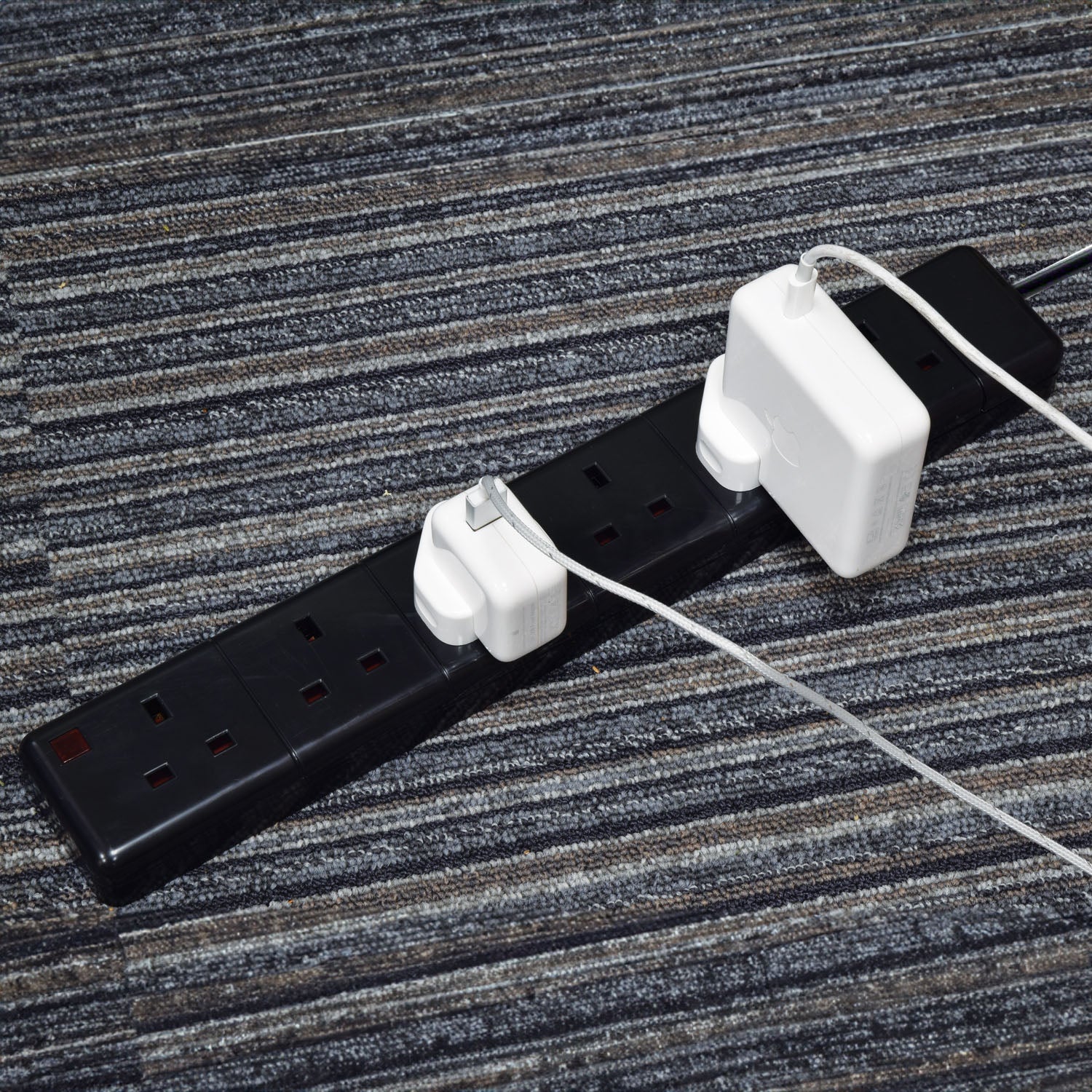A 13A rated 6-gang trailing socket featuring a neon power indicator and convenient keyhole slots for easy wall mounting.