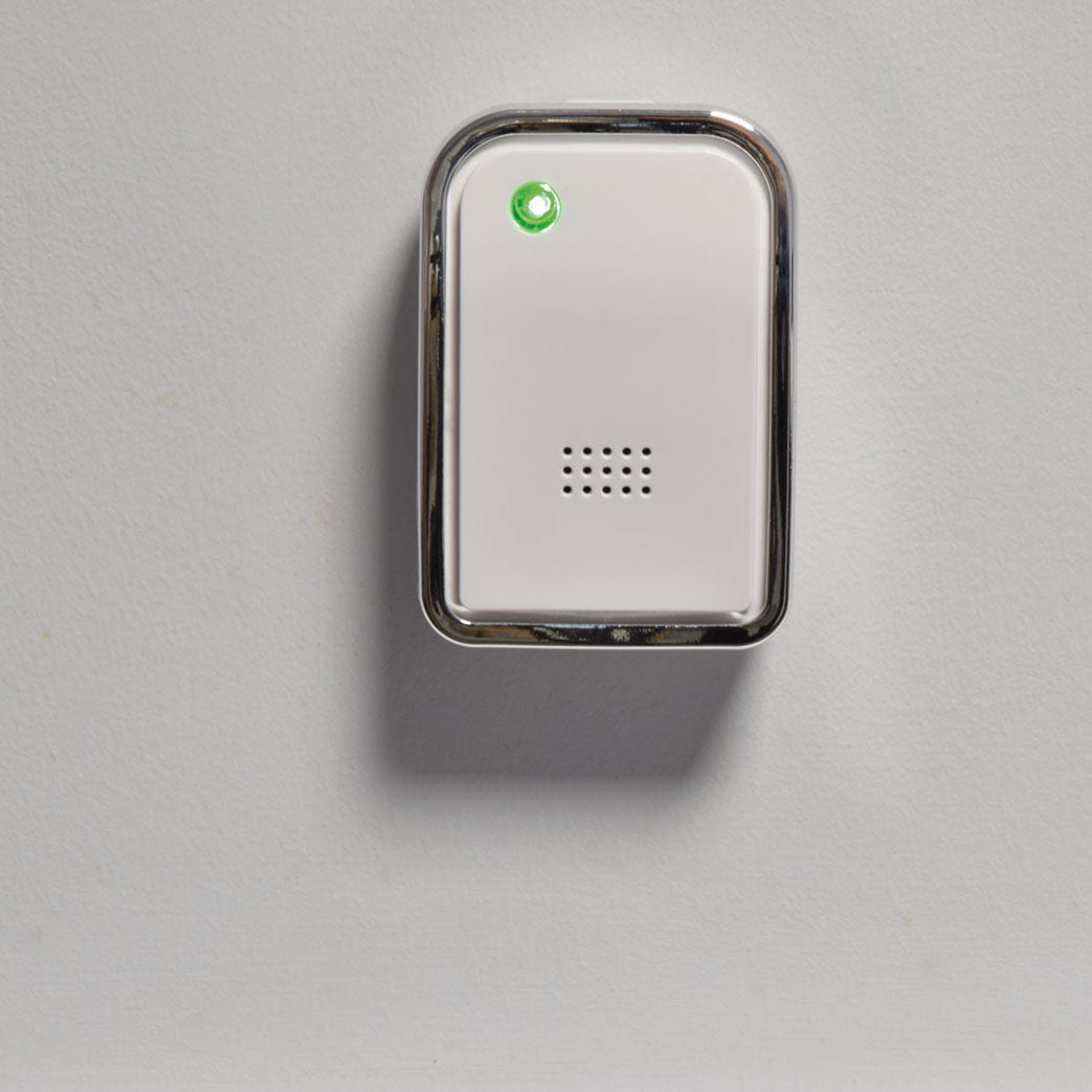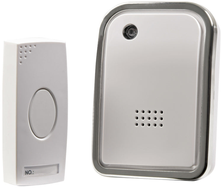 A stylish portable battery operated wireless doorbell with visual indication and 38 melodies. Easy to setup and use, the internal chime unit can be wall mounted or free-standing. When activated, a green LED flashes on the internal unit, making it ideal for noisy environments or for those who are hard of hearing.