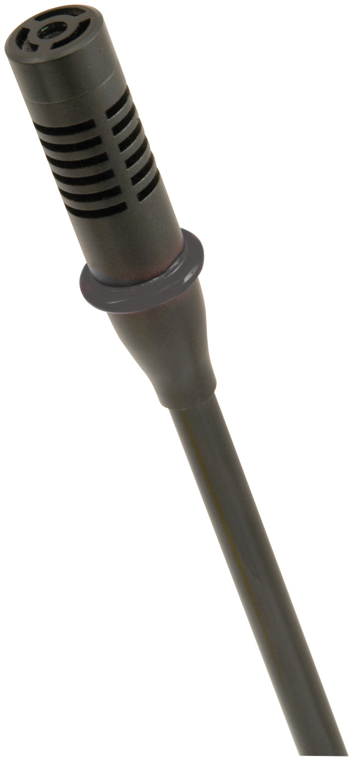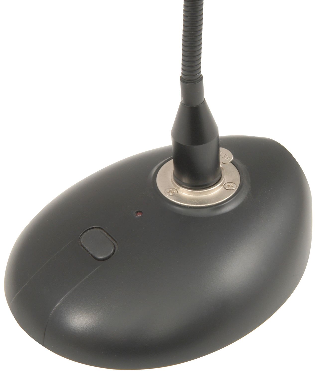 A flexible stem microphone with base for conferences or meetings. Connection to the base is via XLR and provides power to the condenser microphone capsule either from 2 x AAA batteries in the base or from external phantom power.