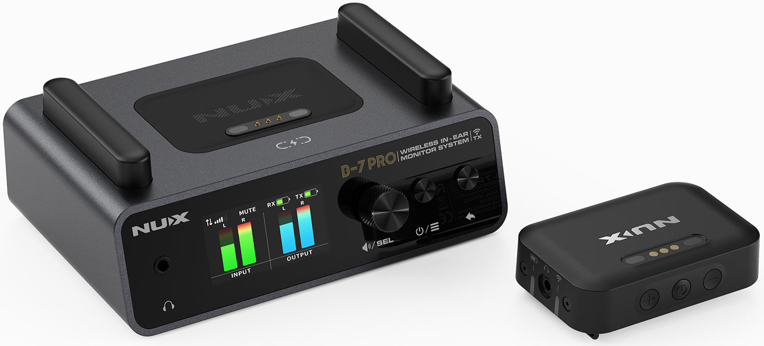 B-7 Pro is a professional wireless in-ear monitoring system operating in the 2.4GHz band. A fully digital signal path delivers high quality stereo audio with minimal latency and a range of up to 50m. The receiver (RX) can be clip-mounted to clothing or a guitar strap and can be re-charged from the main transmitter (TX) or via USB-C. The TX is itself rechargeable or can operate directly from the supplied 9Vdc power adaptor and can even double as a USB audio interface for recording to a PC or Mac computer. Onboard the TX is a full colour display showing signal and battery status for both TX and RX units and serves a settings menu for adjusting signal levels, display and transmission preferences. In addition to balanced left & right signal inputs, there is a stereo Aux input and a wired Phones output. A screw adaptor is also provided to enable the transmitter to connect with standard action camera clamps if preferred for mounting to a stand or fixture. In summary, the B-7 Pro offers the latest wireless technology with unique features to deliver reliable high-quality monitoring for even the most demanding of performers.