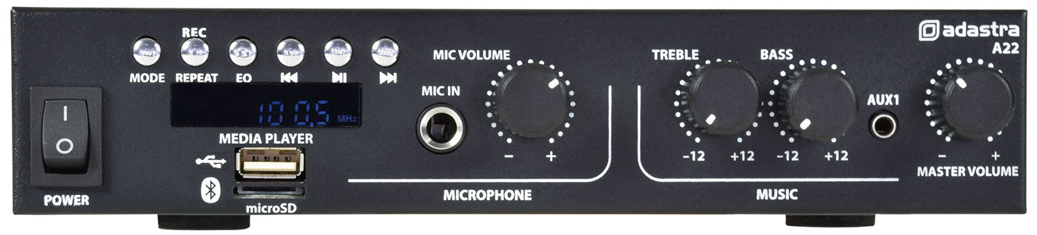 Adastra: 953.422UK, A22 Stereo PA Amplifier, 2x55W Max Output, Bluetooth, USB/microSD, FM Tuner, Remote Control