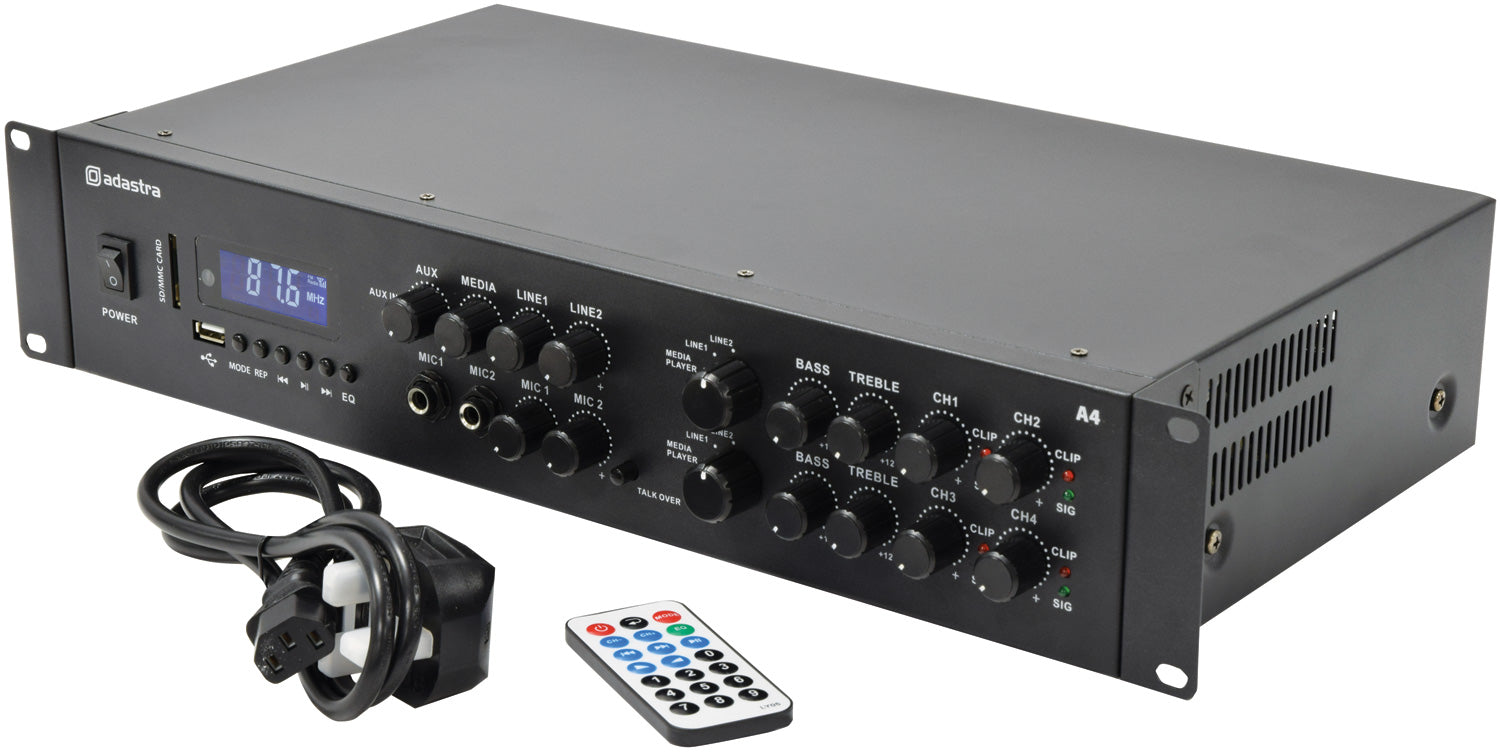 Adastra: 953.404UK, A4 Dual Stereo PA Amplifier, 2 x 200W, Bluetooth, USB/SD Playback, Independent Stereo Zone Outputs