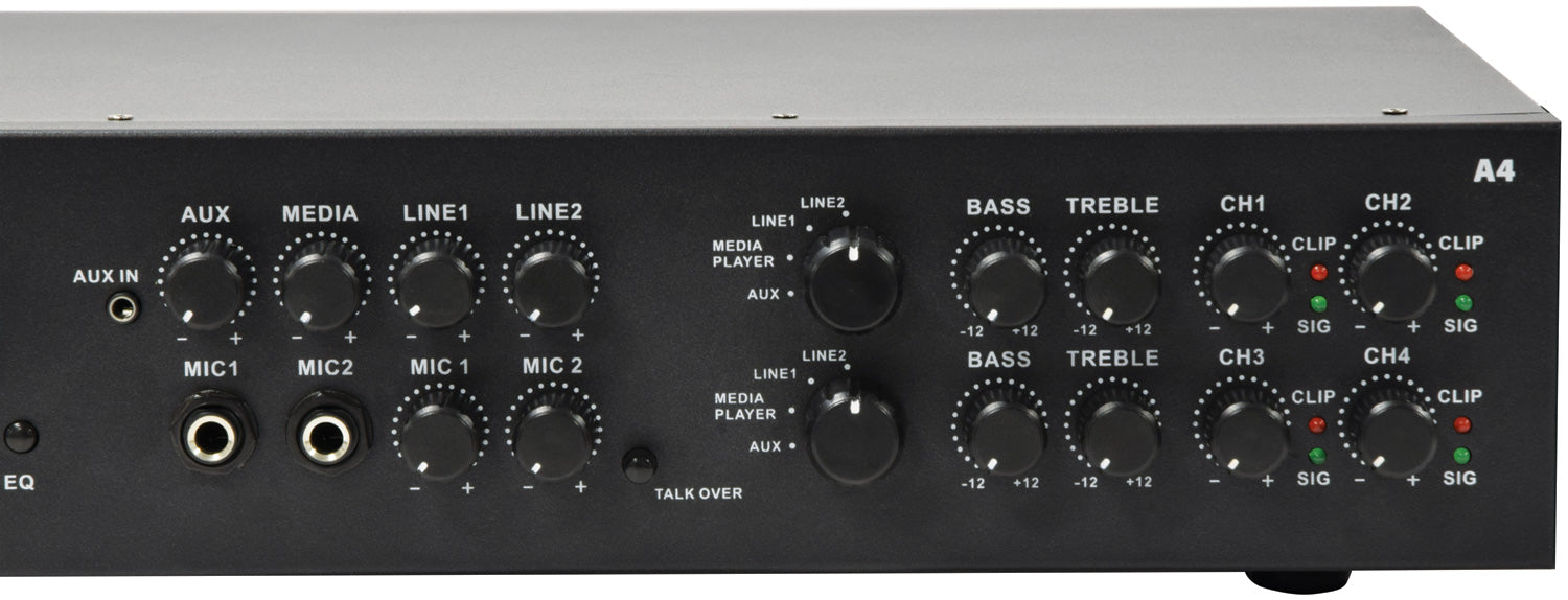 Fully featured PA amplifier with 2 independent stereo zone outputs and mixer section for 2 microphones and a stereo audio source. An inbuilt media player section offers playback of mp3 audio tracks from USB drive or SD card. It also has a Bluetooth receiver. A rotary switch for each output zone selects the stereo playback audio from a choice of 2 rear stereo inputs, a front 3.5mm stereo input or the built-in media player. Mic inputs 1 and 2 are live to both output zones at all times. 2 pairs of speaker connections on the rear panel are via 4mm binding posts, which can drive up to 2 x 8 Ohm speakers on each of the 4 channels. Designed to offer installers a comprehensive dual zone PA for bars, restaurants and function rooms.