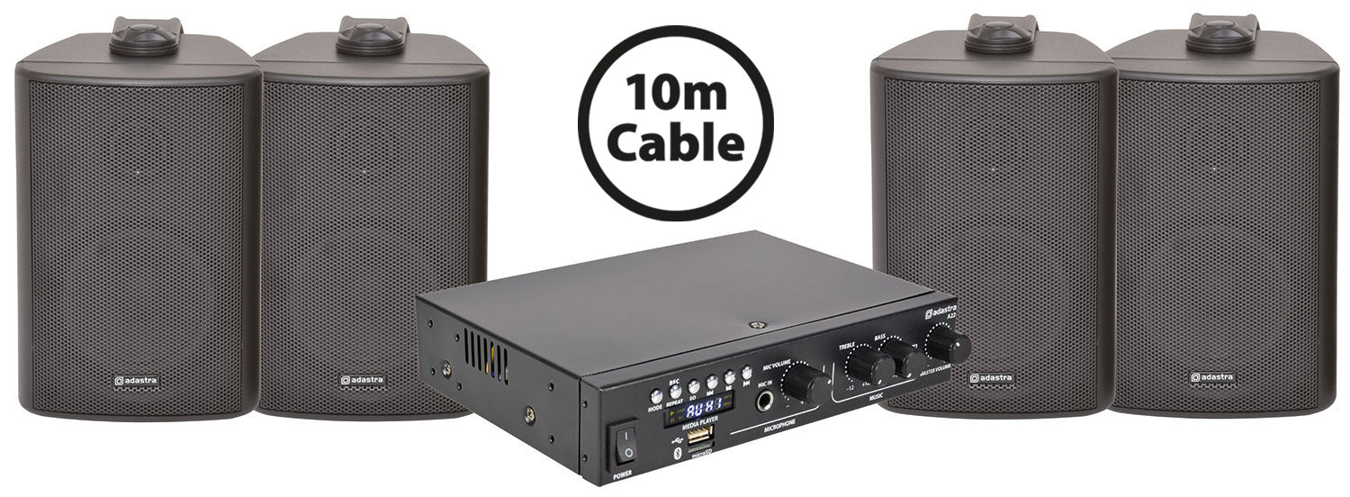 Adastra: 300.004UK, BC3 Background Music Package, A22 Amplifier, 4 Black 3" Speakers, Bluetooth, USB/microSD, FM Tuner