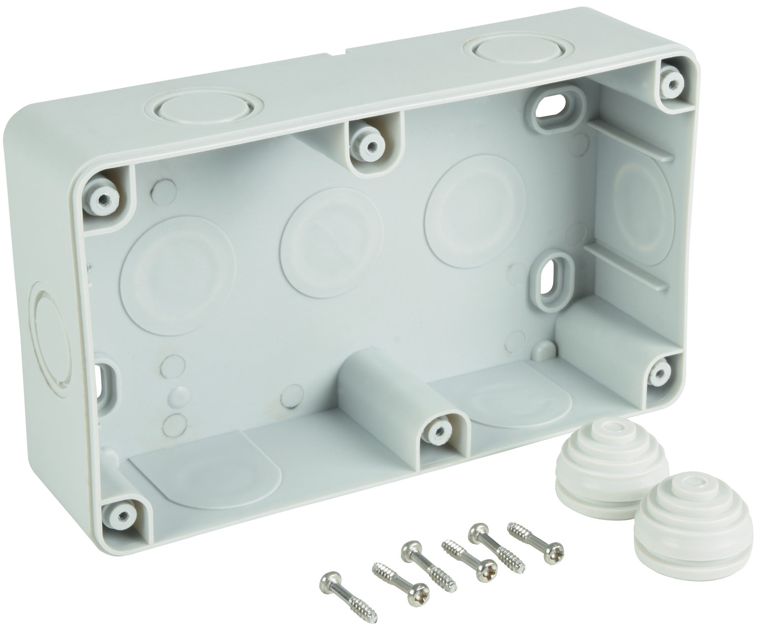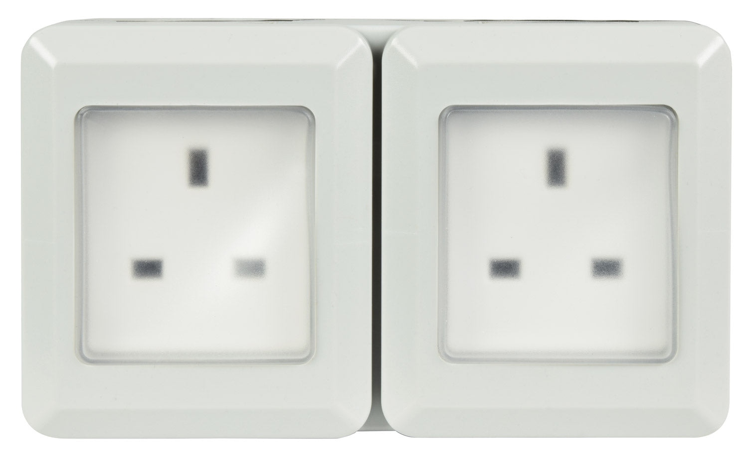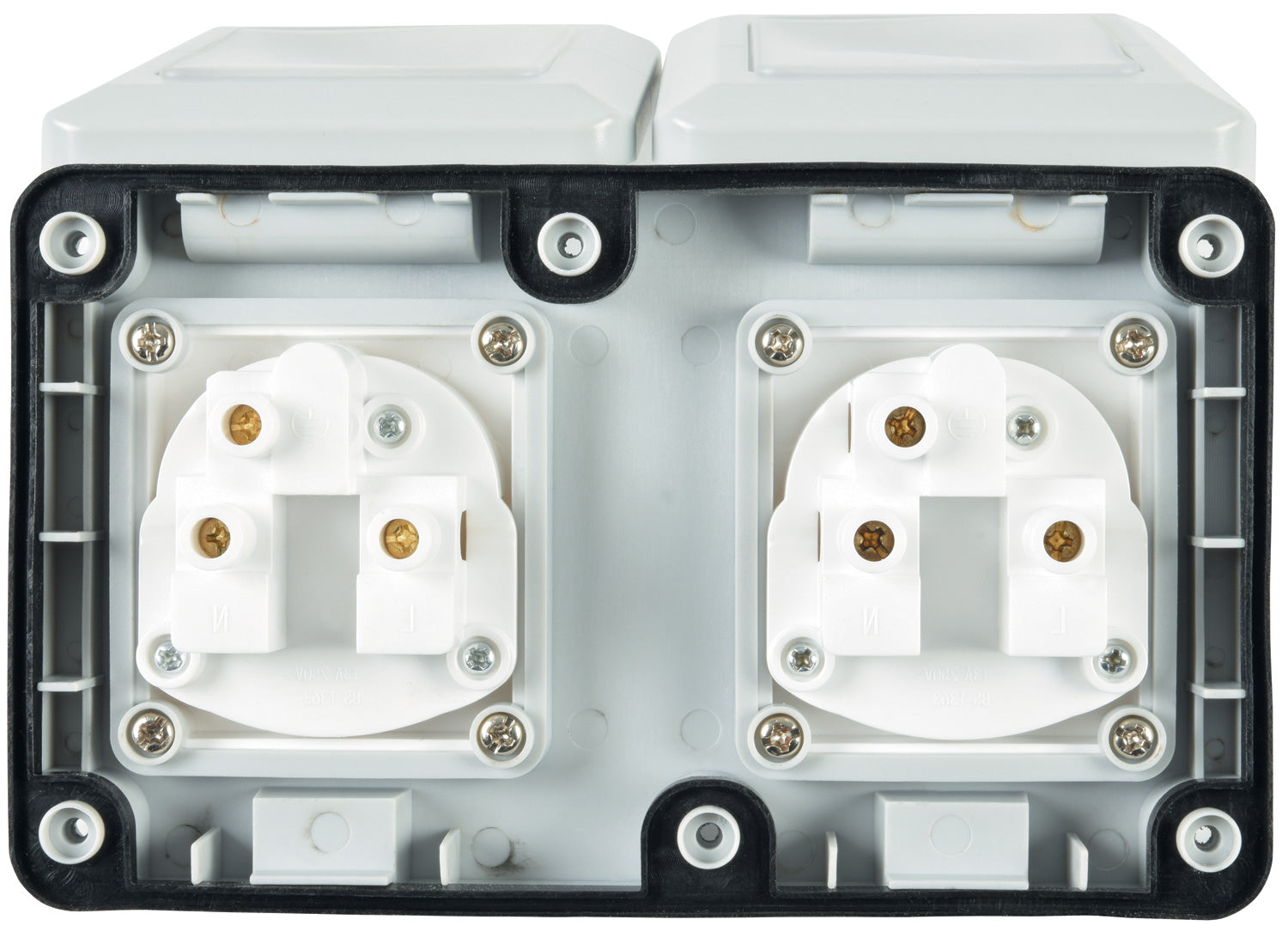 An easy to install 2 gang weatherproof mains socket with 2 separate IP55 rated covers, providing a safe and reliable outdoor power point.