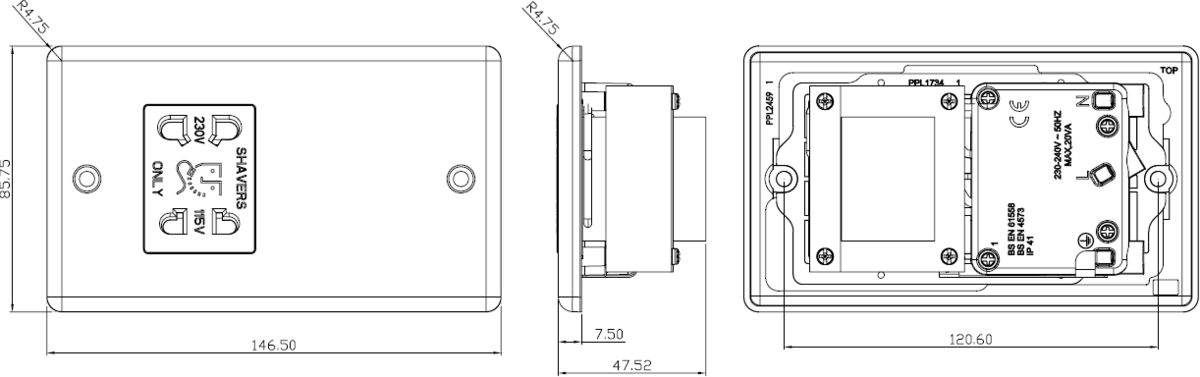 Knightsbridge: CL89PCG, Dual Voltage Shaver Socket, 115/230V, Polished Chrome Finish, Grey Insert, IP41 Rated