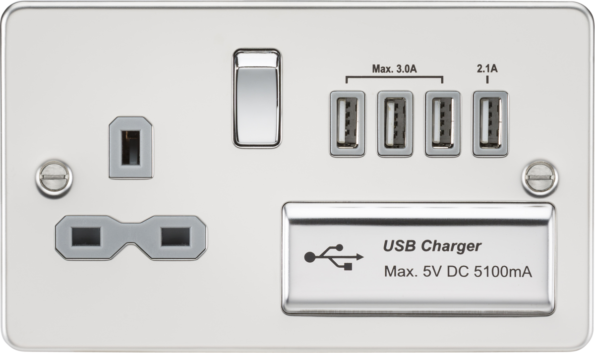 Knightsbridge: FPR7USB4PCG, 13A Switched Socket with Quad USB Charger, Polished Chrome, 230V, 5V 5.1A, BS1363-2