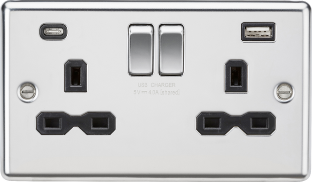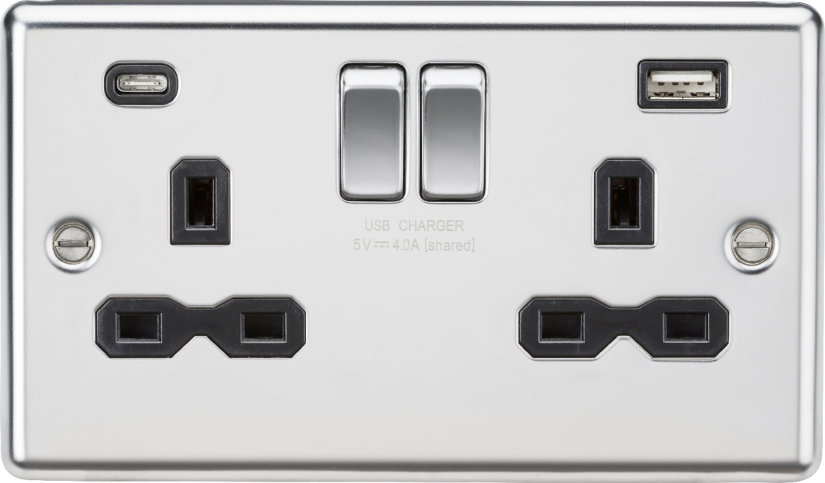 ML Accessories 13A 2G SP Switched Socket with Dual USB C+A, Polished Chrome with Black Insert