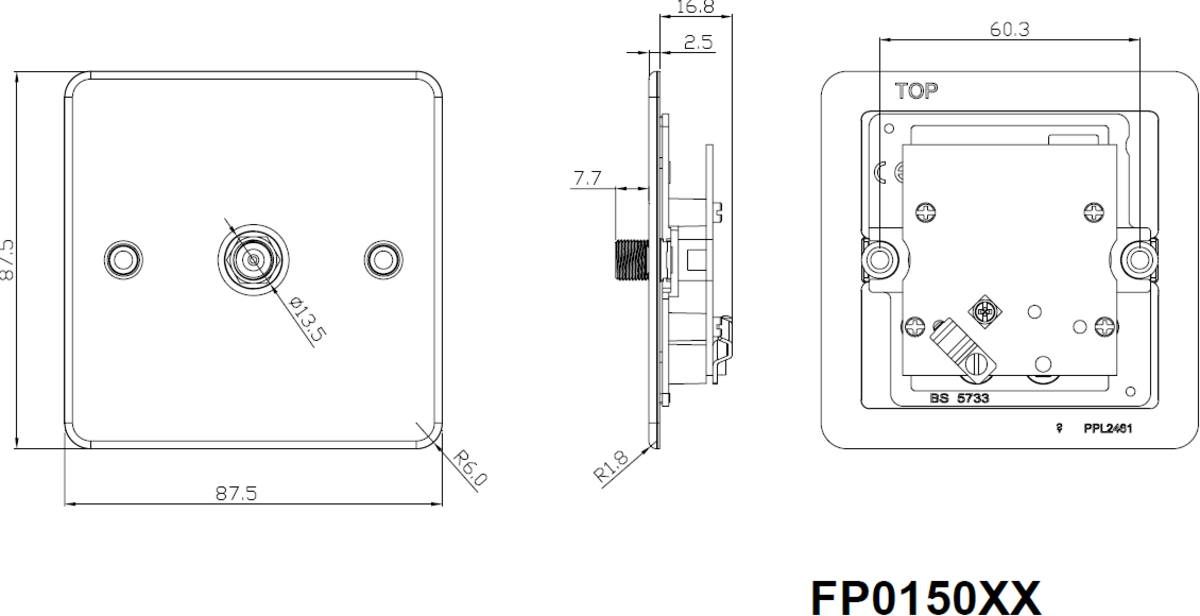 Knightsbridge: FP0150PB, SAT TV Outlet, Non-Isolated, Flat Plate Design, Polished Brass Finish, BS 5733 Certified