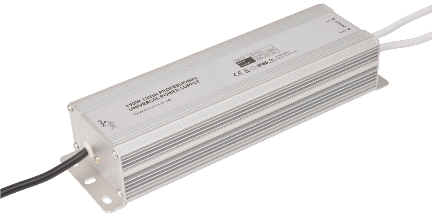A range of IP67 rated 12Vdc power supplies, available in a range of power output ratings from 30W to 150W, suitable for both indoor and outdoor LED Tape & lighting installations. For professional use only.
