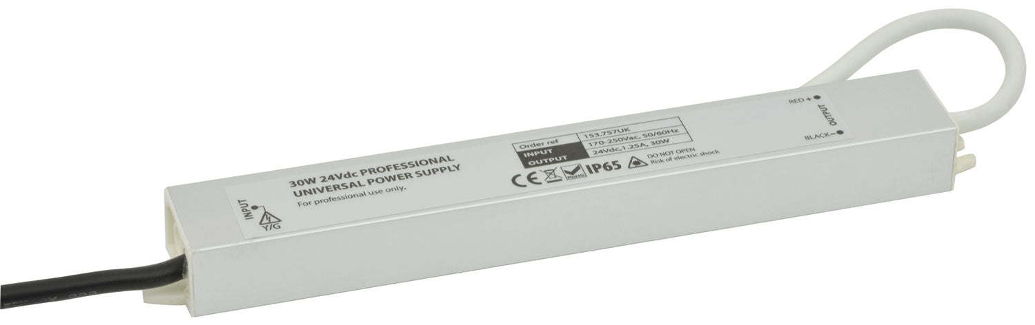 A range of IP67 rated 24Vdc power supplies, available in a range of power output ratings from 30W to 300W, suitable for both indoor and outdoor LED Tape & lighting installations. For professional use only.
