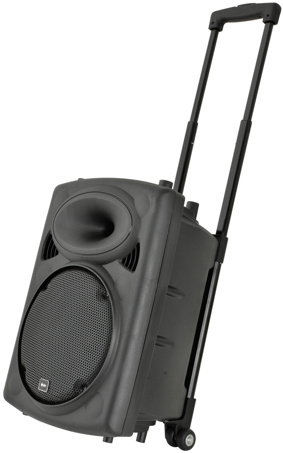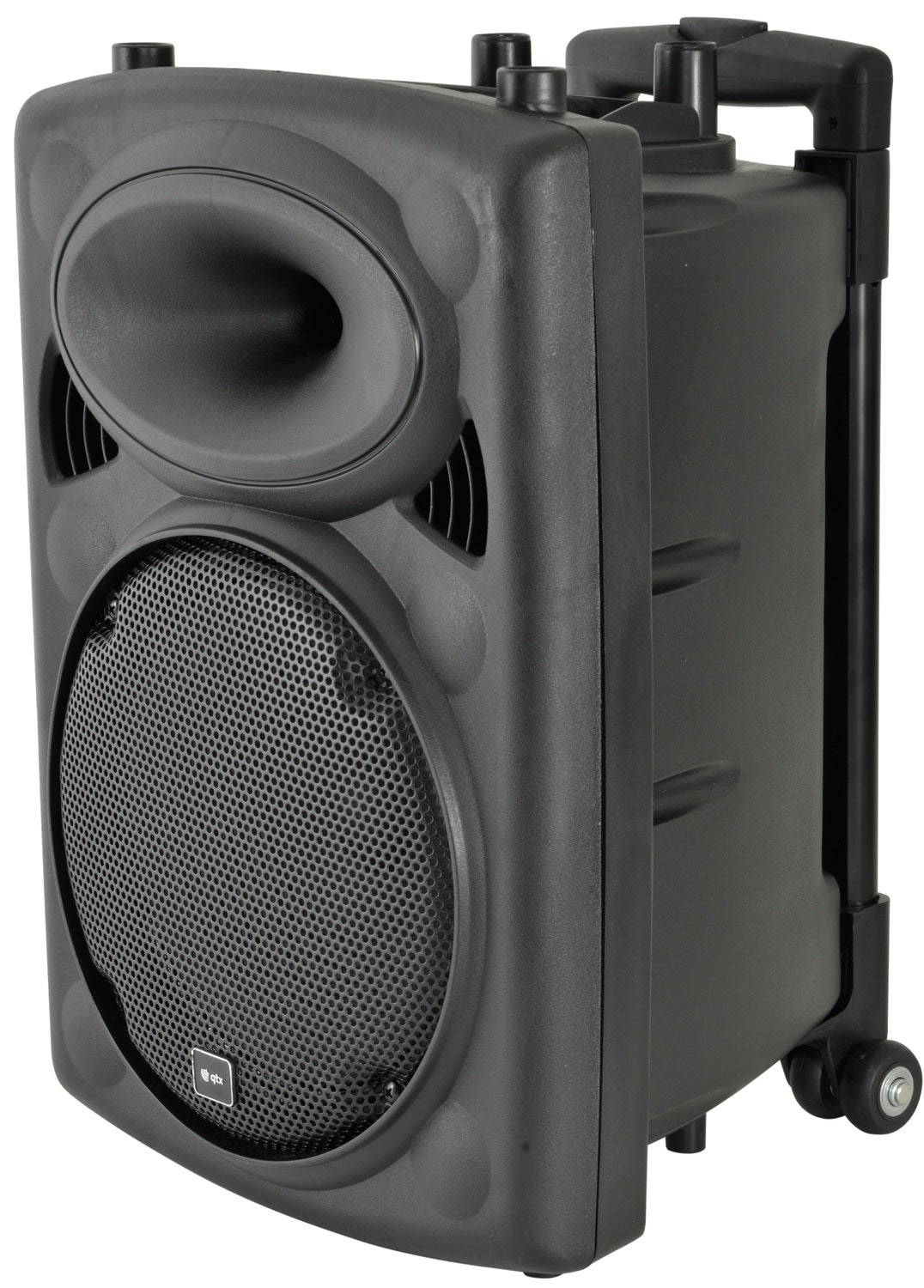 Compact portable PA unit based on the QR speaker cabinet. Built-in amplifier operating from mains or internal rechargeable battery powering a main driver and compression driven horn unit. Two VHF handheld wireless microphones are included (one on 8” and 10” versions) with the receiver built into the mixer/amp section at the rear along with a further two wired mic inputs, auxiliary line input and integral USB/SD/FM media player with record function. A B/T receiver is also built into the media player to enable pairing with a smartphone or tablet for wireless audio playback. A retractable trolley handle and rear wheels provide easy portability.