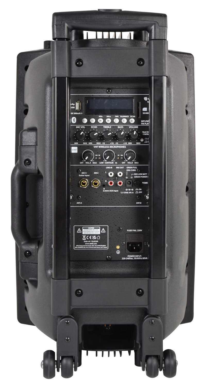 A self-contained PA system with pull and carry handles for easy portability, and a host of connectivity options including Bluetooth. The unit is supplied with 2 VHF wireless microphones, and features 2 further mic inputs, one of which doubles as a guitar input. The aux input is ideal for phones, tablets, laptops, and mp3 players; and the RCA in/out adds DJ connectivity and expansion/recording possibilities. SD and USB media, an integrated FM radio tuner, and paired Bluetooth devices can be controlled via the internal media player with IR remote control. A switchable VCV ‘voiceover’ function automatically lowers the volume of background music when a mic signal is received. Powered by mains or internal rechargeable battery (up to 8 hours), and pole/stand mountable.