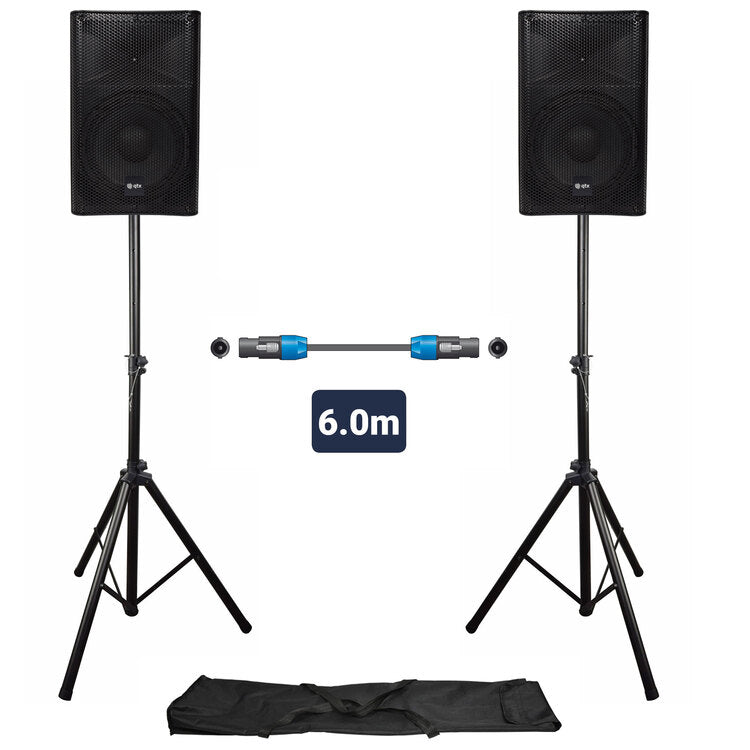 Complete PA system comprising a QUEST active speaker with built-in media player and QUEST satellite passive speaker with a 6m link cable. Supplied with a pair of tripod speaker stands with carry bag. Available in 3 sizes.