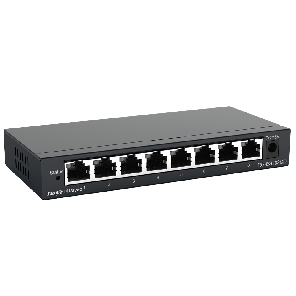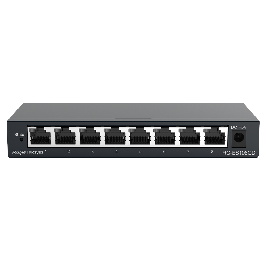 Ruijie: RG-ES108GD, 8-Port Unmanaged Switch, 10/100/1000Mbps, Non-PoE, Metal Casing, Silver