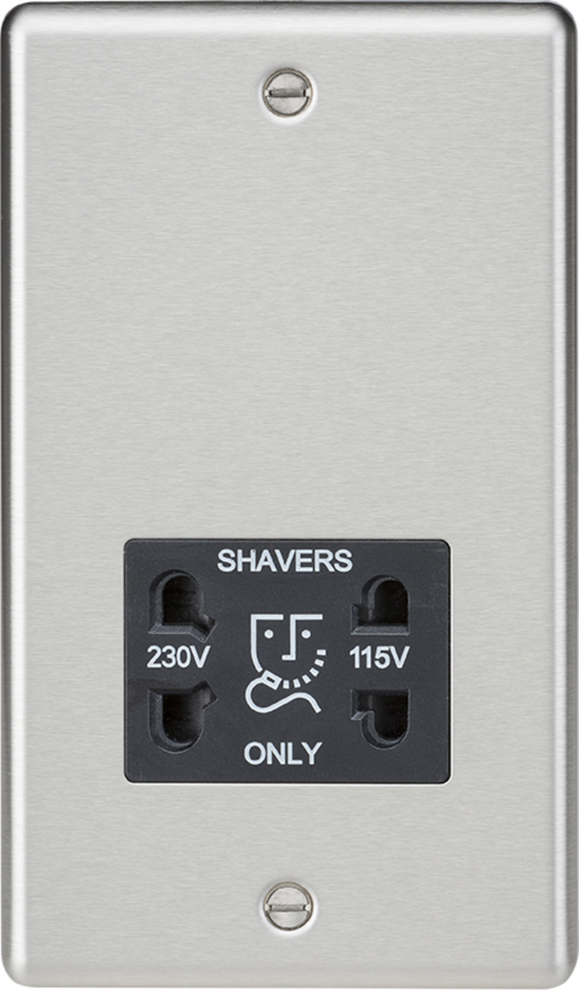 The 115/230V Dual Voltage Shaver Socket in Brushed Chrome with Black Insert is a perfect blend of functionality and contemporary design for bathrooms.