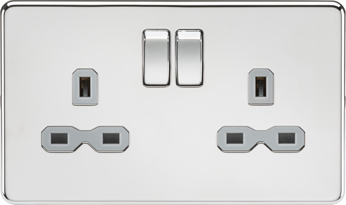 Knightsbridge: SFR9000PCG, 13A 2G DP Switched Socket, Polished Chrome, Grey Insert, Screwless Low Profile, BS 1363:2 Certified