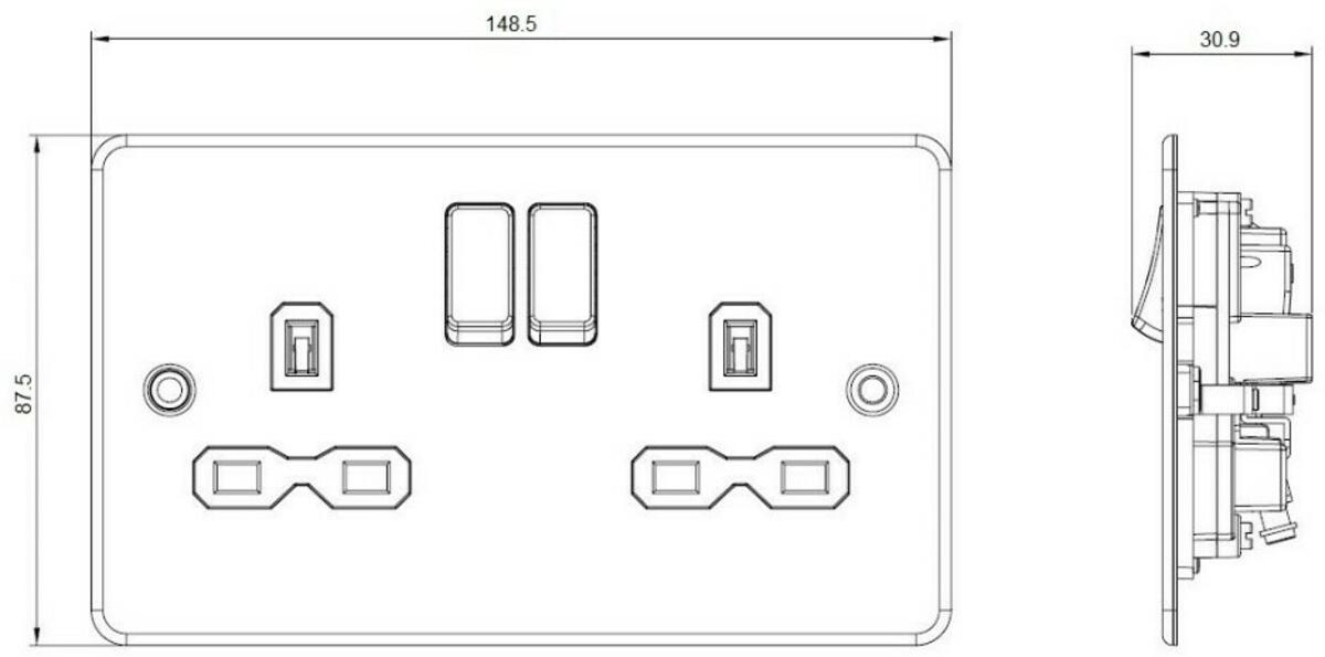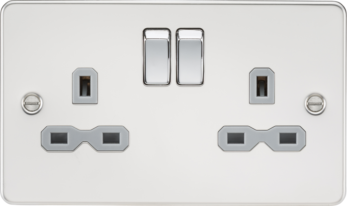 The 13A 2G DP Switched Socket with Twin Earths in Polished Chrome with Grey Insert is the perfect finishing touch to any modern home. This ultra-low profile Flat Plate metal design is equipped with matching metal rockers and a unique socket insert that is completely hidden once a plug is inserted.