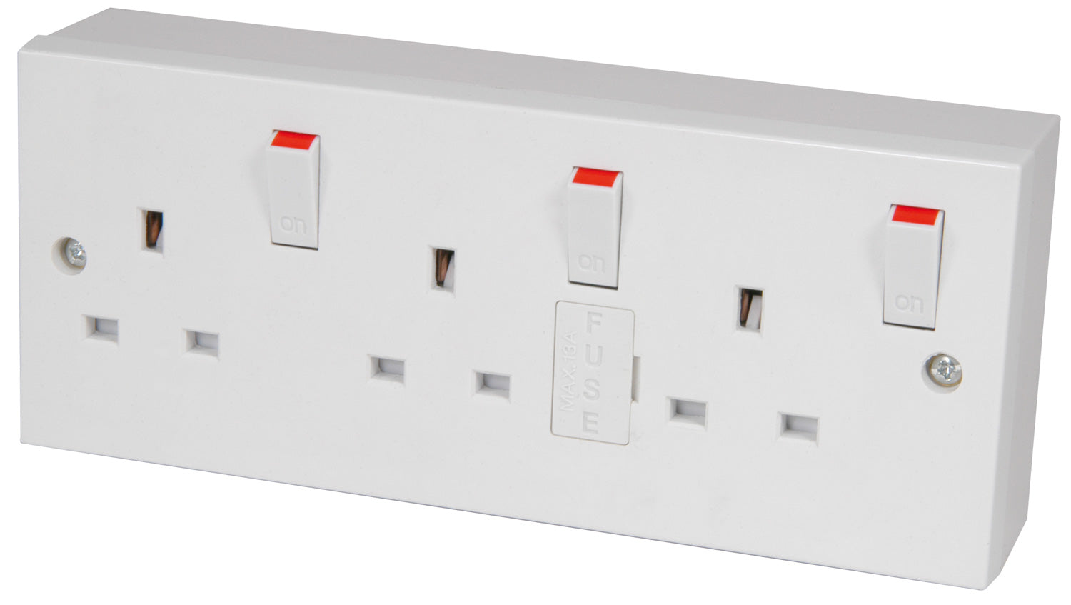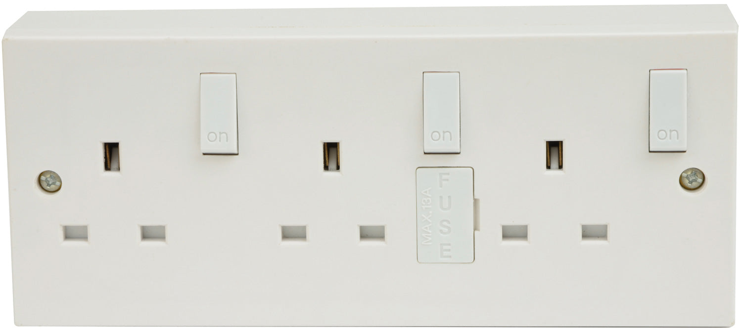 A 13A, 3 gang switched mains outlet socket with an integral fuse holder.