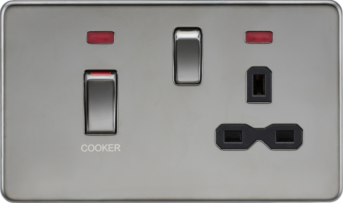 The 45A DP Switch & 13A Socket with Neons in Black Nickel provides safe control and isolation for your cooking appliances.