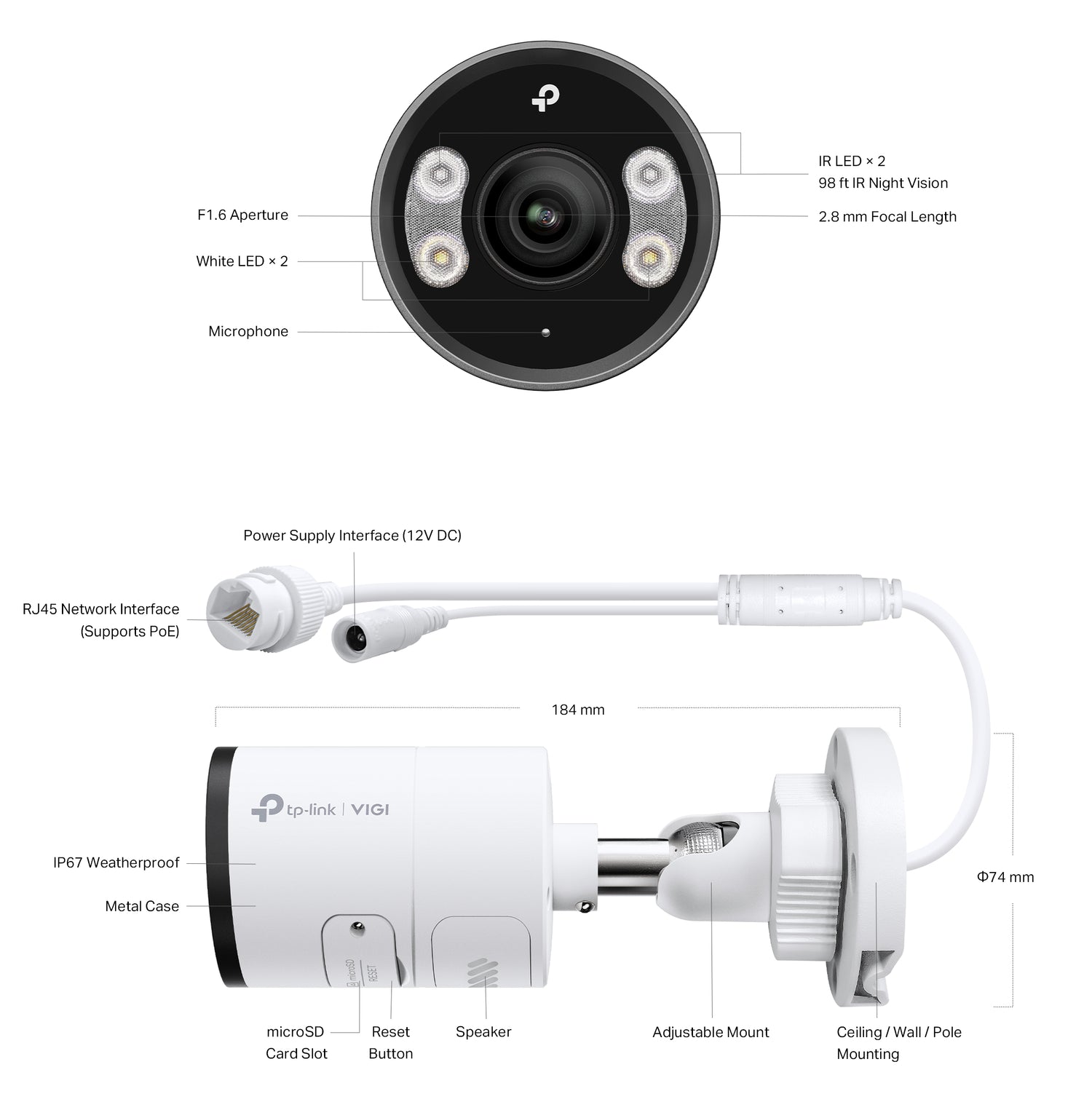 Outfitted with a high-sensitivity 1/2.7” progressive scan CMOS sensor, the VIGI S345 captures ultra-sharp 4MP footage in a variety of lighting conditions. The F1.6 aperture, full-colour imaging, and dual IR LEDs allow this camera to maintain superior visibility even in complete darkness (up to 30 metres), making it ideal for monitoring driveways, gates, warehouses, or external retail perimeters.