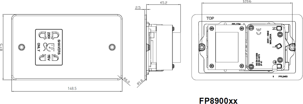 Knightsbridge: FP8900BC, Dual Voltage Shaver Socket, 115/230V, Brushed Chrome, Low Profile Design, IP41 Rated, 20VA