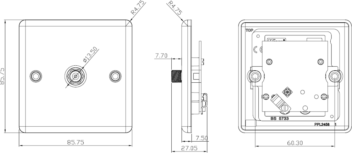Knightsbridge: CL015PC, SAT TV Outlet, Non-Isolated, F-Type Connection, Polished Chrome, BS 5733 Certified, Rounded Edge