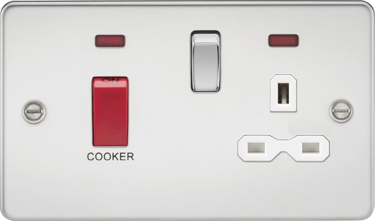 Knightsbridge: FPR8333NPCW, 45A Double Pole Switch with 13A Socket, Neon Indicators, Polished Chrome, Flat Plate Design, 230V