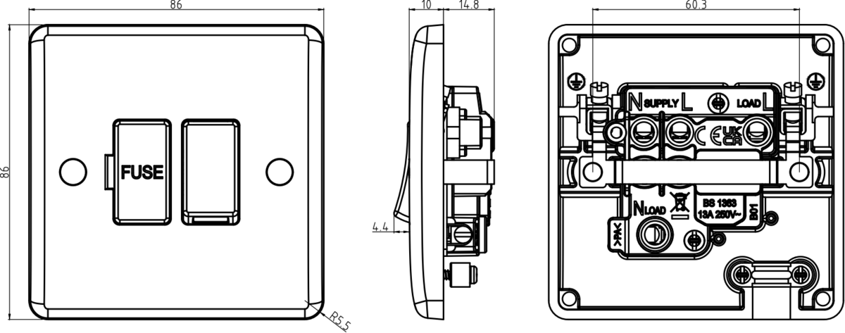 • Dimensions:Width 86 mm, Height 86 mm, Projection 10 mm, Minimum Mounting Box Depth 25 mm