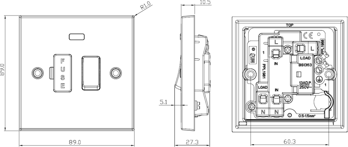 The 13A Switched Fused Spur Unit features a modern brushed chrome finish, providing both aesthetics and functionality. This unit is designed for both residential and commercial use, ensuring safe operation for various electrical devices.