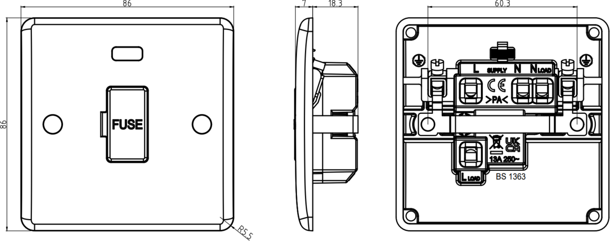 • Dimensions:86 mm width, 86 mm height, 7 mm projection, 25 mm minimum mounting box depth