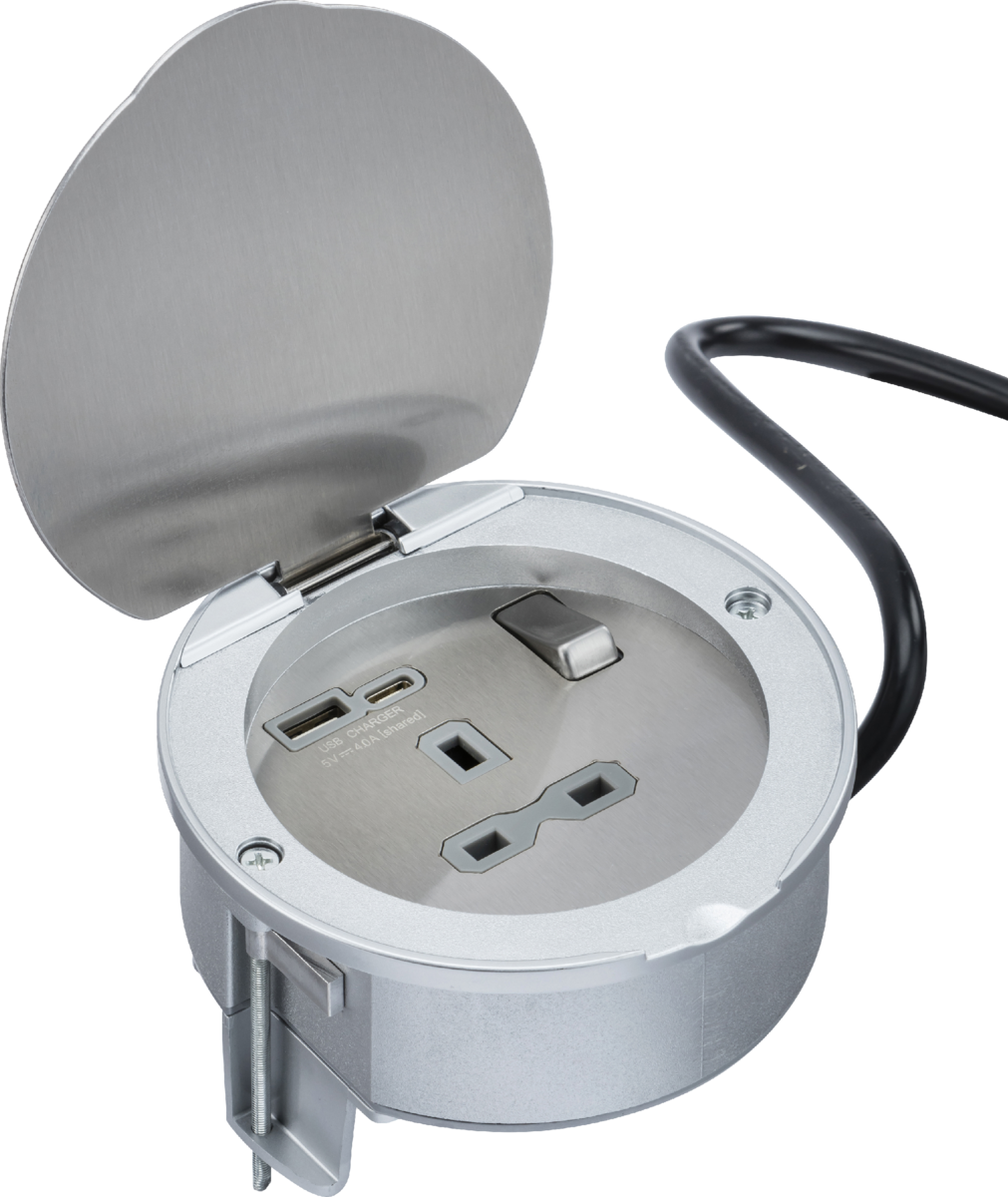 This model has a stainless steel lid to protect/hide what's below. Supplied with a pre-fitted 2m cable with plug top for easy install. Ideal for Hot Desking areas, Home Offices and Hotel Desks.