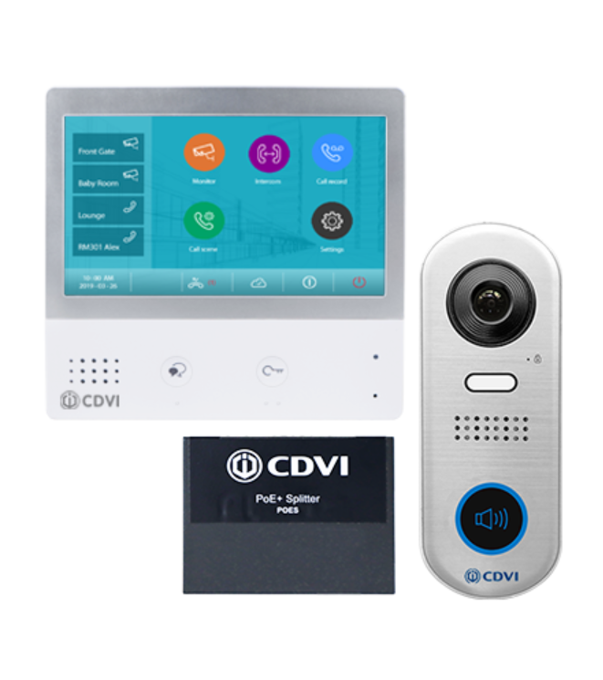 • Included Kit:CDV-471IP touchscreen monitor, CDV-91IP single-button door station, CDV-POE4P switch