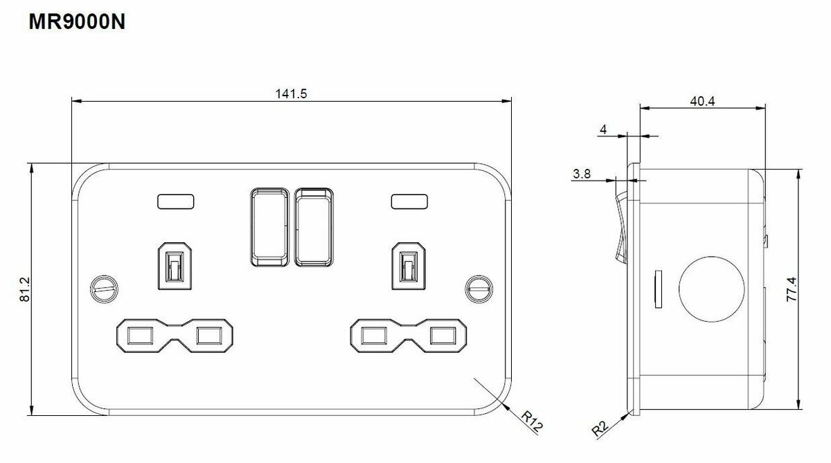 Knightsbridge: MR9000N, Metal Clad 13A 2G DP Switched Socket, Neon Indicator, Powder-Coated Silver/Grey, IP20, 230V, 13A