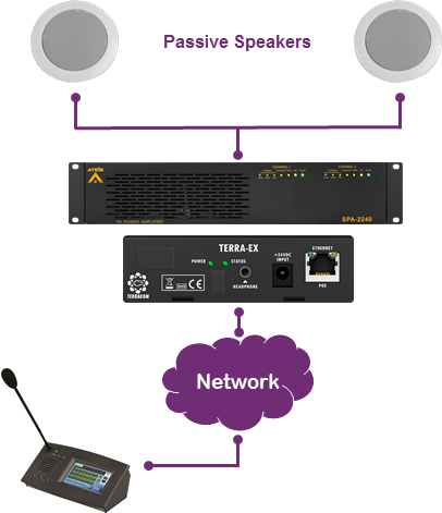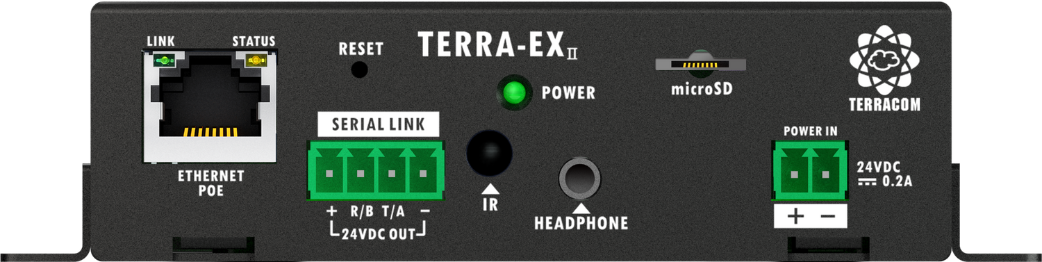 The TERRA-EX IP Audio Decoder is a versatile device capable of voice, paging, intercom, music streaming, audio routing, and scheduled announcements. It connects easily using CAT5/6 cables and supports PoE, simplifying installation with a single cable for both power and audio.