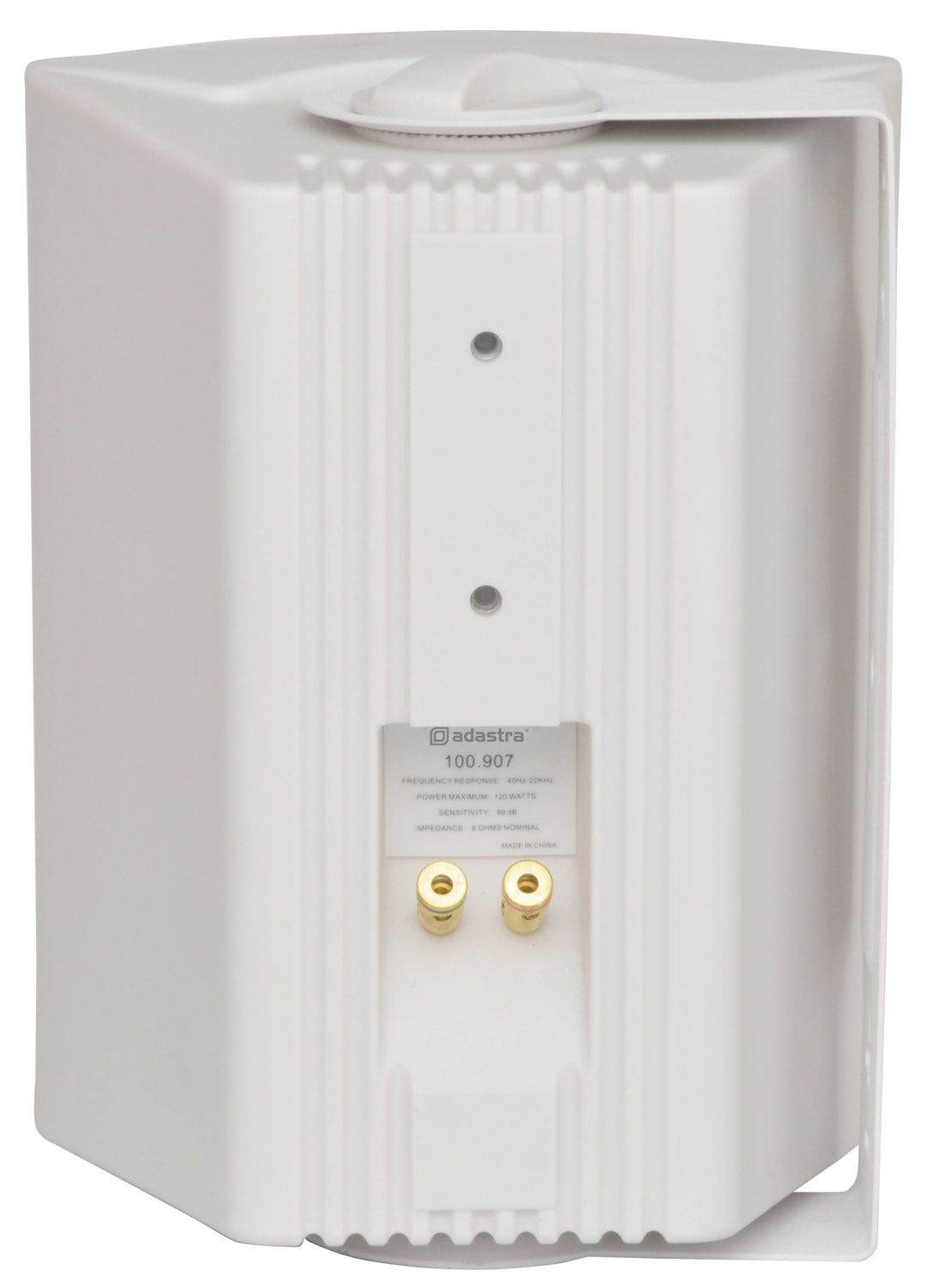 Industry standard indoor speakers with ABS enclosures and a powder coated steel grille. Wall or ceiling surface mounting via the adjustable steel bracket. Each with standard 8 Ohms impedance and supplied in pairs for connection from a stereo amplifier. Main drivers have high quality coated paper cones for full-sounding low and mid-range frequencies, ideal for music playback and clear voice announcements.