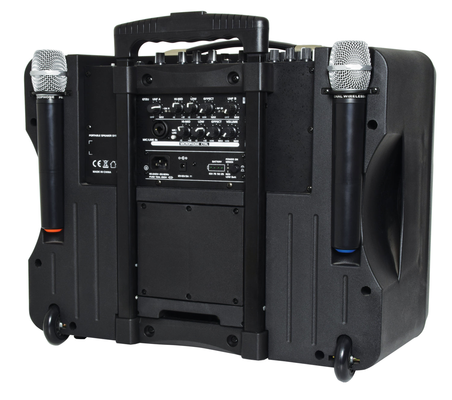 The DELTA-200 is a fully featured portable PA unit in a rugged, injection-moulded combo-style enclosure. Designed with multi-input performances and presentations in mind, the main unit has input channels for 2 instruments, independent Line and Aux inputs, and a separate Mic/Line input channel. In addition, the DELTA-200 system is also supplied with 2 UHF wireless microphones and contains an inbuilt dual receiver with independent controls. A media player section has options for mp3 playback from a USB pen drive or SD card, an FM radio tuner and a Bluetooth receiver for pairing with a smart phone or tablet. The integral 200W amplifier section delivers enough power and bass response for music performances and public address to medium sized audiences. Mains or battery operation and a trolley mechanism for portability give the DELTA-200 freedom and flexibility to provide sound coverage almost anywhere.