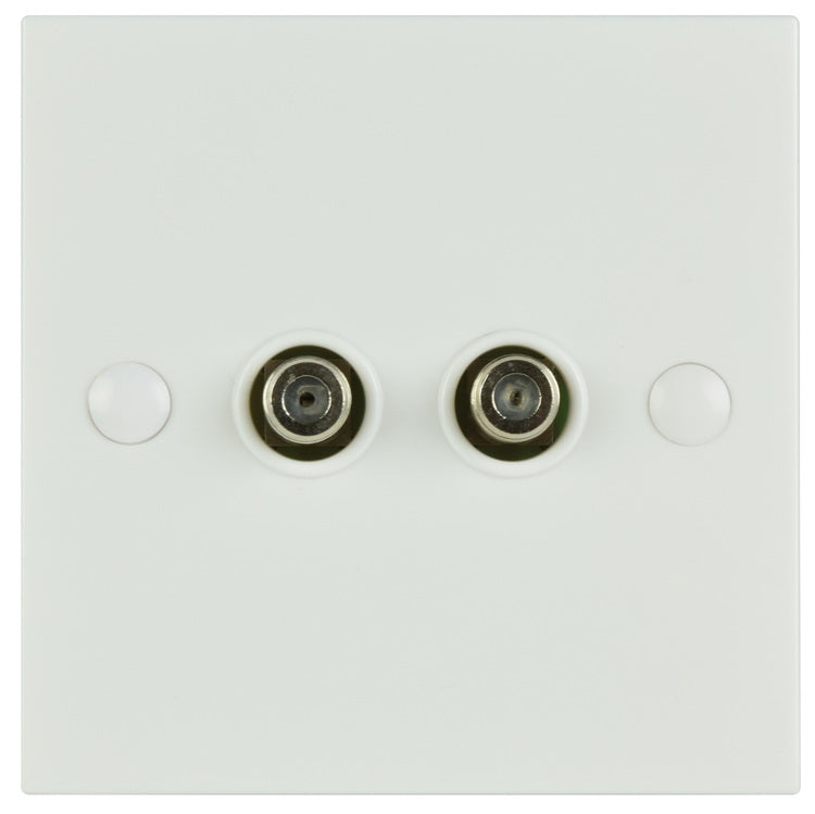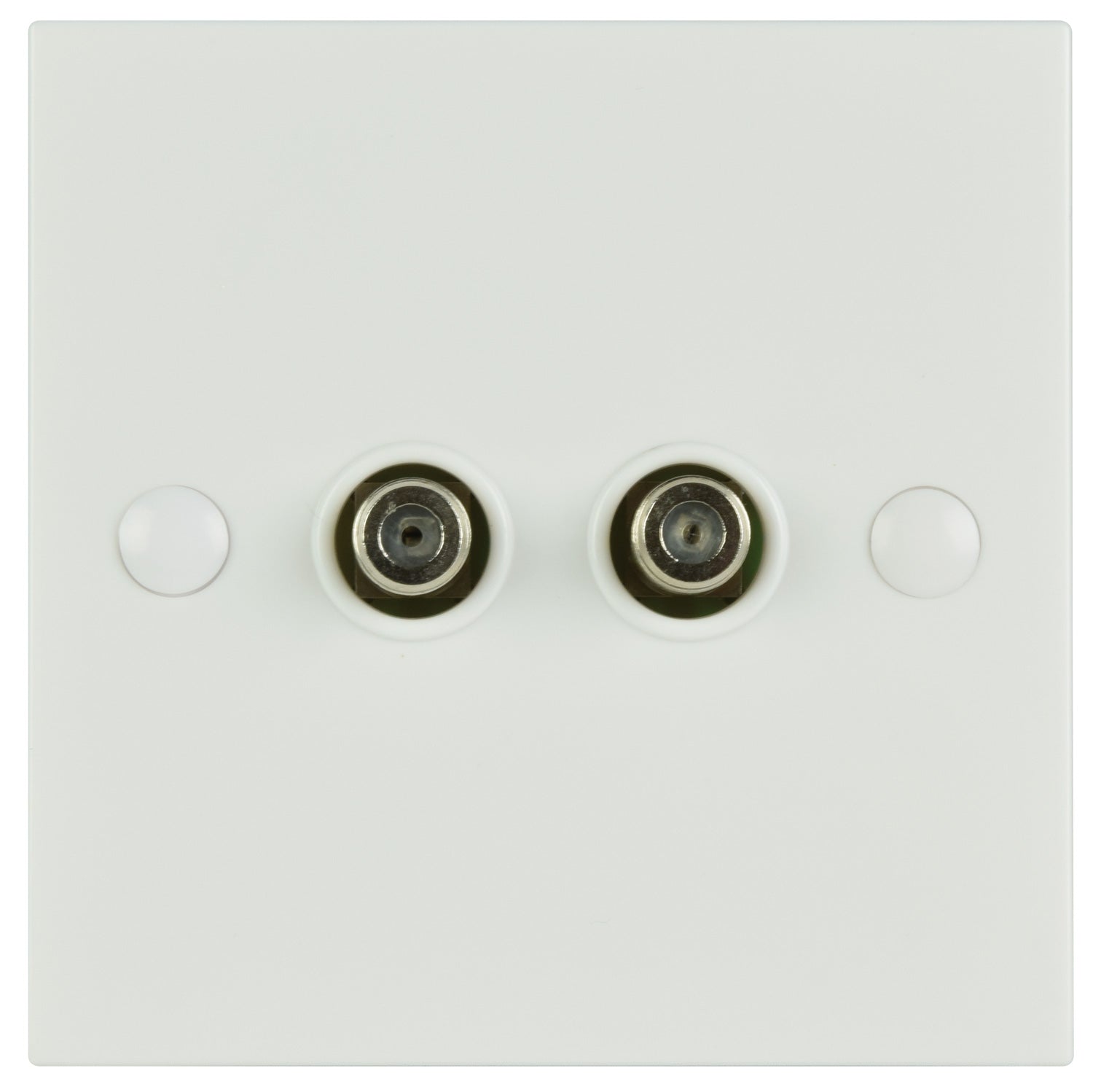 A white plastic flushmount wallplate with twin F-Type Connectors for satellite and cable signals.