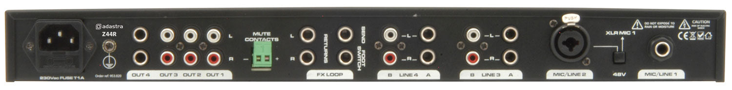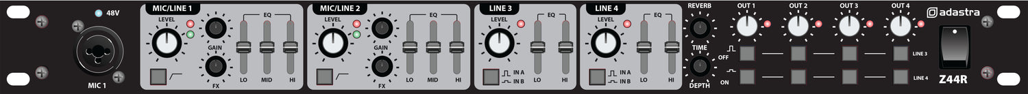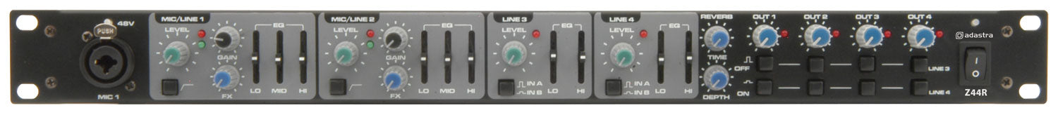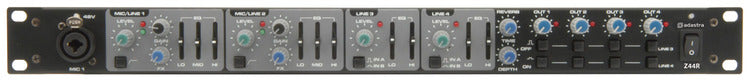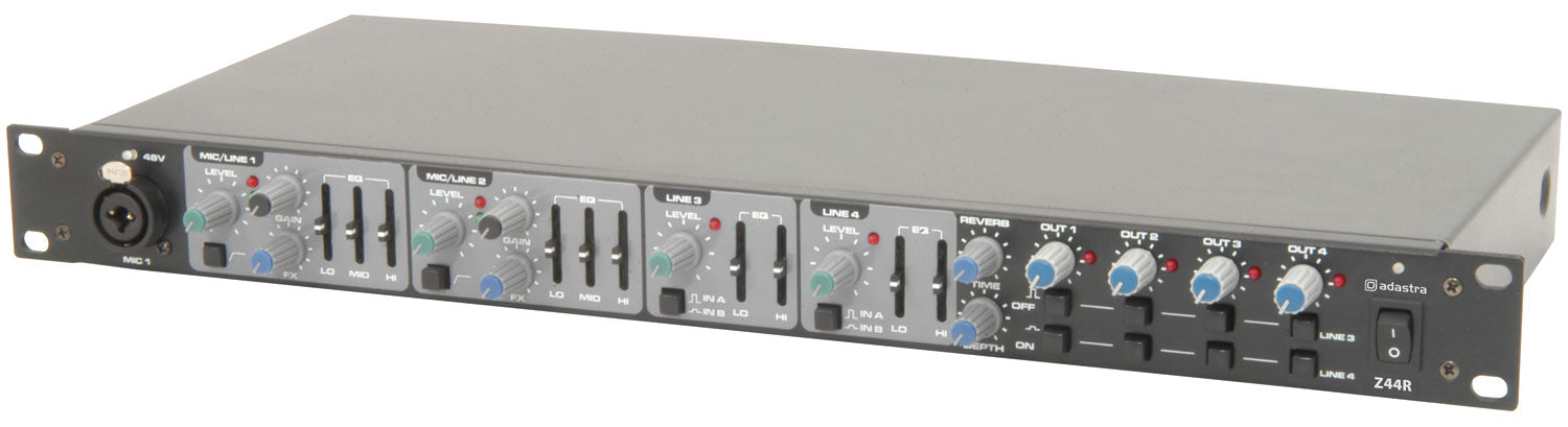 Adastra: 953.020UK, Multi-purpose 1U Mixer, 2 Mic/Line Inputs, 4 Stereo Outputs, 48V Phantom Power, DSP Reverb