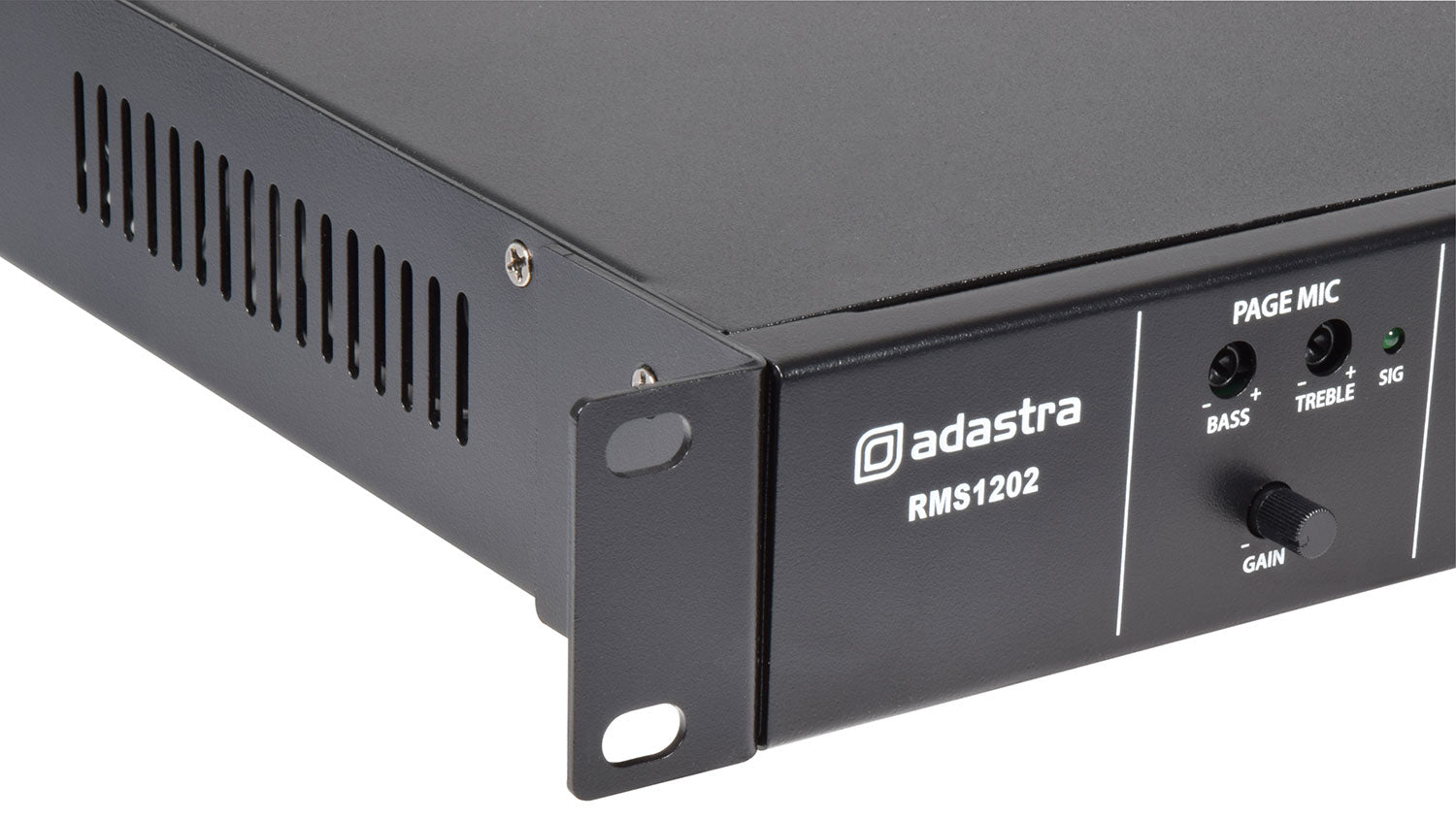 Multi-channel 100V slave amplifier with independent outputs for 100V or 4-16 Ohm speakers. Each amplifier channel has its own independent line input, which can be switched to a global auxiliary, providing the option of the same input to several of the amplifier channels if required. A paging microphone input is provided for voice alerts and a 24V mute terminal can be connected to an alarm panel for emergency evacuation override. Class D circuit design and efficient toroidal transformers have enabled a design which fits into a 1U rack-mount housing. The RMS-series amplifiers can be applied as high power slave units or equally as a fully independent zoning system for a multi-room installation.