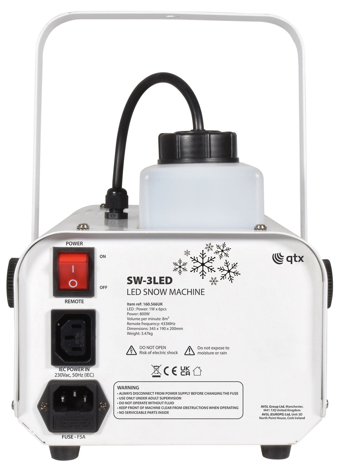 QTX: 160.566UK, SW-3LED LED Snow Machine, 800W, 3.47kg, 1.2L Fluid, RF Remote