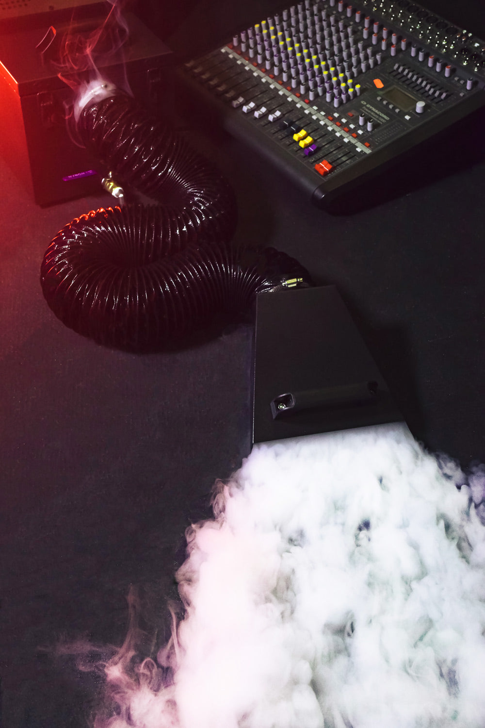 Stage effect machine producing 'dry ice' type low fog effects without the use of carbon dioxide or ice. New technology delivers a ground-hugging mist from standard fog fluid and water. Housed in a full flight case with castors for portability, the main unit has a removable fluid tank and easy access water reservoir with drain tap. The mist is delivered via a flexible duct and output funnel to allow the user to direct the effect onto a specific area of the stage. Operated by the onboard digital control panel, which can be detached as a wired remote or via DMX512. Designed to provide a dramatic low flowing mist scene for stages, theatres and themed events.